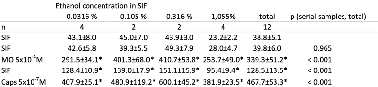 Table 4 Trigeminal ganglia, different ethanol concentrations. CGRP release in pg/ml, all values are means ± SEM, *p < 0.05